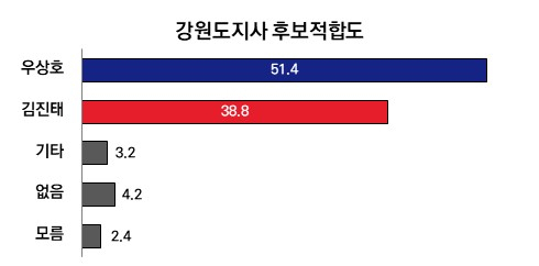<프레시안>이 시그널앤펄스에 의뢰해 지난 13일~14일 이틀간 강원도 거주 만 18세 이상 성인남녀 800명을 대상으로 여론조사를 실시한 결과 강원도지사 후보 적합도에서 우상호 후보는 51.4%, 김진태 지사는 38.8%로 나타났다. 지지율 격차는 12.6%포인트로 오차범위(±3.5%포인트) 밖이다.