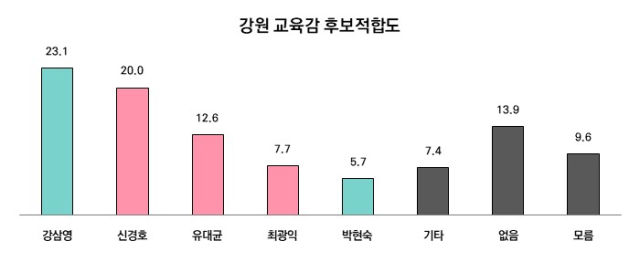 강원도교육감 선거 여론조사에서는 현재 출마가 거론되는 강삼영 강원 민주진보교육감 단일후보, 박현숙 한라대학교 조교수, 신경호 현 강원도교육감, 유대균 전 교육부 장학관, 최광익 전 강원도교육감직인수위원장 등 5인에 대한 가상대결을 진행했다.