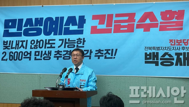 백 후보는 15일 전북도의회에서 기자회견을 열고 “도민은 빚을 내서 버티고 있는데 전북도 행정은 체감 가능한 대응을 내놓지 못하고 있다”며 “지방채 발행 없이도 2600억 원 규모 추경 편성이 가능하다”고 밝혔다.