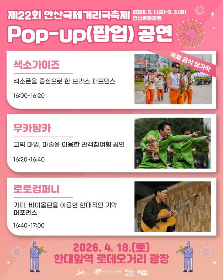 경기 안산시와 안산문화재단이 ‘제22회 안산국제거리극축제’ 개막을 앞두고 시민들이 일상 속에서 거리예술을 먼저 만날 수 있는 팝업 공연을 운영하며 축제 분위기 확산에 나선다.