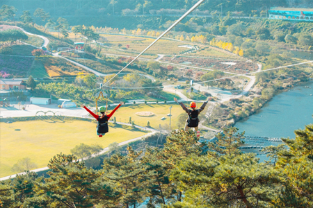 짚와이어는 정원 전경과 추령천을 내려다보며 활강하는 체험 시설로, 출렁다리와 부치봉 산책로를 거쳐 탑승장에 오르면 이용할 수 있다.