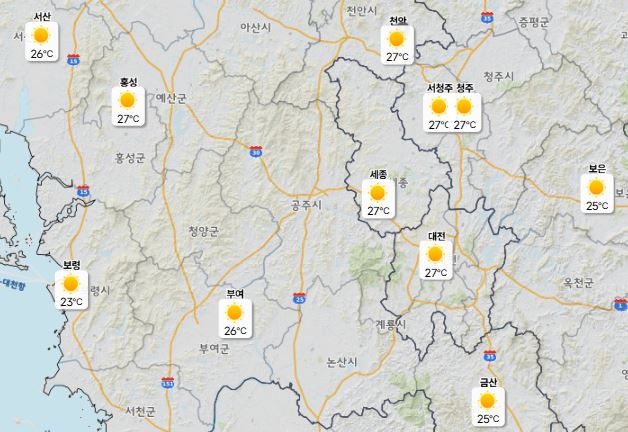 이날 낮 최고기온은 대전·세종·청주·천안 27도까지 오르겠고 아침 최저기온은 12도로 예보돼 기온차도 크게 나타날 전망이다.