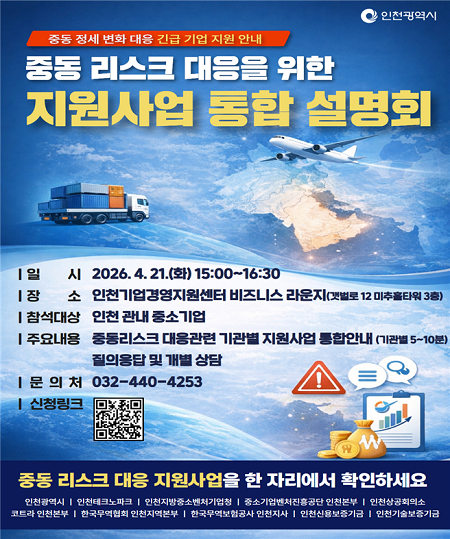 인천광역시는 중동 지역 분쟁 장기화에 대응해 ‘중동 리스크 대응 지원사업 통합 설명회’를 오는 21일 개최한다고 19일 밝혔다.