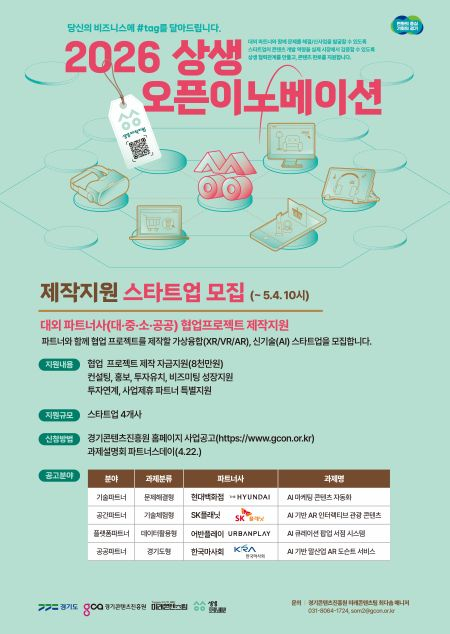 경기도와 경기콘텐츠진흥원은 도내 유망 스타트업과 대·중견기업 간 협업을 통해 실질적인 판로 개척을 지원하는 ‘2026 상생 오픈 이노베이션’ 제작 지원 사업에 참여할 기업 4개 사를 다음 달 4일(오전 10시)까지 모집한다.