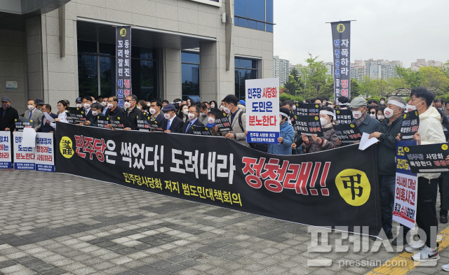 국민주권행동 전북본부 등으로 구성된 ‘민주당사당화저지 전북도민대책위’는 22일 전북특별자치도의회 앞에서 총궐기대회를 열고, 경선 과정과 지도부 판단에 문제를 제기했다.