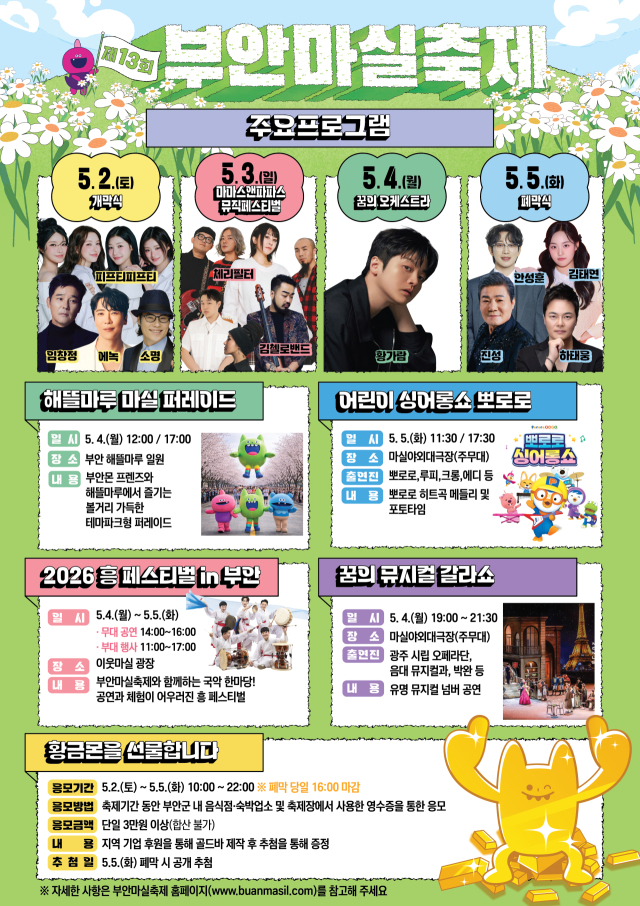 이번 축제의 핵심 프로그램은 ‘황금몬을 선물합니다’와 ‘기아 모닝 차량 추첨’이다. 특히 순금 3돈 상당의 카드형 골드바를 증정하는 ‘황금몬’ 이벤트는 부안군 대표 캐릭터 ‘부안몬 프렌즈’를 활용해 재미와 상징성을 더했다. 해당 경품은 관내·관외 방문객 각 3명씩 총 6명에게 추첨을 통해 제공된다.