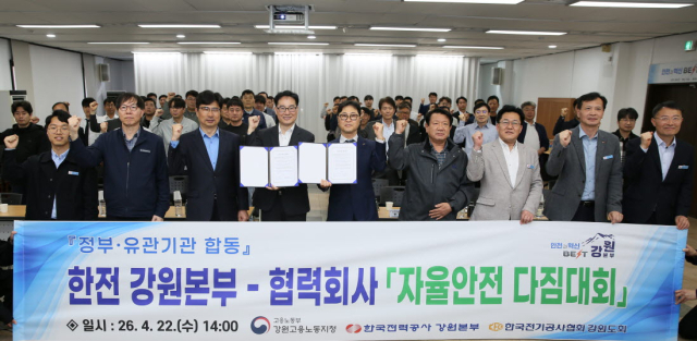 한국전력 강원본부(본부장 이철휴)는 22일 본부 사옥 강당에서고용노동부 강원지청(지청장 김상용), 전기공사협회 강원특별자치도회(회장 한정훈) 및 협력회사와 함께 ‘자율안전 다짐대회’를 개최했다.