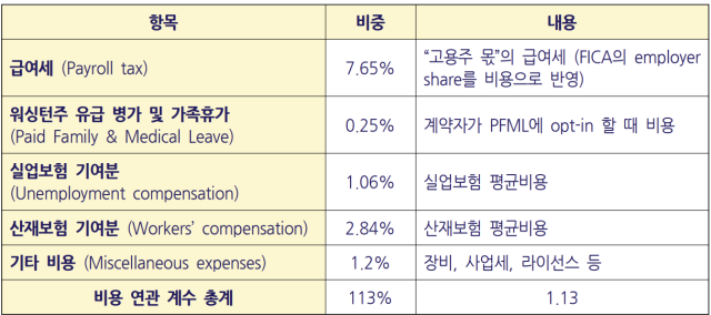 그럼 1.12라는 비용 연관계수와 1.17이라는 시간 연관계수는 무슨 의미를 담고 있을까? 우선 비용 연관 계수(Associated Cost Factor) 1.12라는 수치가 나오는 과정부터 알아보면, 페이업 제도의 적용을 받는 앱 기반 노동자가 부담해야 하는 추가비용 중 세금과 사회보험료, 유급휴가 등을 보전하기 위한 계수라고 할 수 있다.