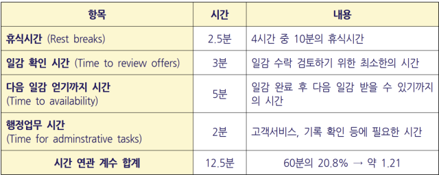 휴식시간, 일감 확인 시간, 다음 일감을 얻기까지 시간, 기록 확인에 소요되는 행정업무 시간 등 플랫폼 노동자의 '대기시간'을 1시간당 12.5분으로 계산해 연관 계수를 1.21로 제시했다. 다만 이해당사자 논의를 거쳐 수정된 2022년 5월 최종안에서는 수치가 1.17로 조정됐다.
