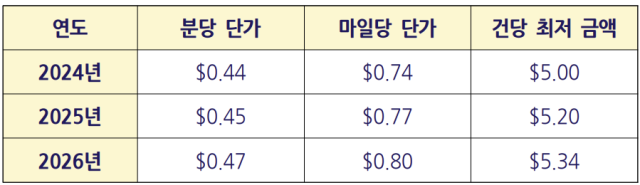 마일당 단가 계산을 위해 올해 미국 국세청(IRS)이 공시한 표준 마일리지 요율 0.725달러에 1.1을 곱하면 0.7975달러가 돼 반올림하면 0.80달러가 된다. 시애틀시 최저임금과 표준 마일리지 요율이 매년 업데이트되기 때문에 분당 단가와 마일당 단가 역시 매년 수치가 갱신된다. 이를 표로 나타내면 아래와 같다.