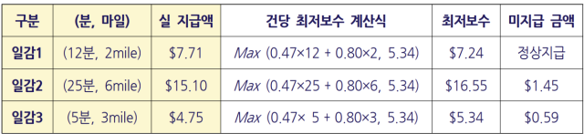 건(일감)당 최저보수 = [1분당 단가 × 운행시간(분)] + [1마일당 단가 × 운행거리(mile)]