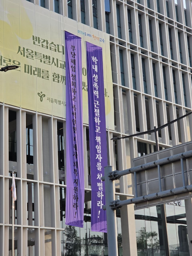 지혜복 교사가 아래로 줄을 내렸다. 차헌호 소집권자가 받아서 안전한 곳에 묶었다. 지혜복 교사가 현수막 천을 정비하고 차헌호 소집권자가 줄을 당겼다. 곧 현수막 2개가 서울시교육청 정면을 가렸다.