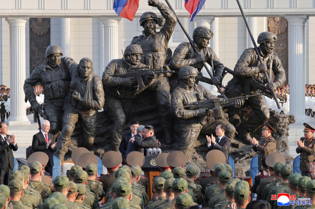 이어 그는 "평화와 주권을 위하여 어깨를 겯고 한 전호에서 싸웠으며 파시즘의 부활을 막고 패권주의 세력의 전쟁 야망을 분쇄하는 데서 관건적 의의를 가지는 전과를 달성했다"며 북한군의 러시아-우크라이나 전쟁 참전의 의의를 과시했다.
