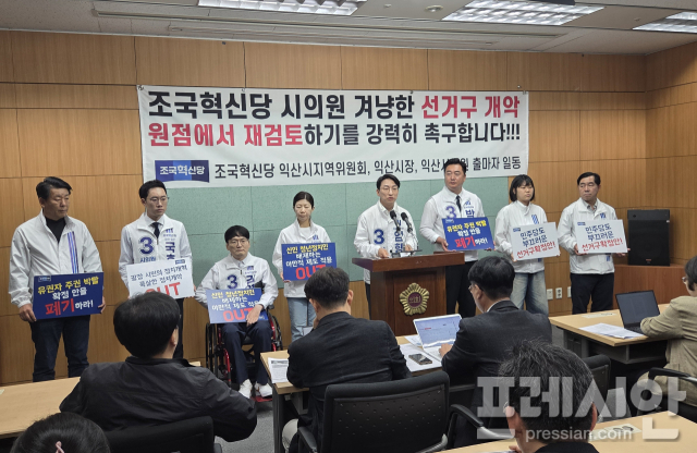 조국혁신당 익산시 지역위원회와 익산시장·시의원 출마자들은 27일 전북특별자치도의회에서 기자회견을 열고 “시민 주권을 박탈하고 한 표의 가치를 왜곡한 선거구 획정안에 맞서 선거운동을 전면 중단한다”고 밝혔다.