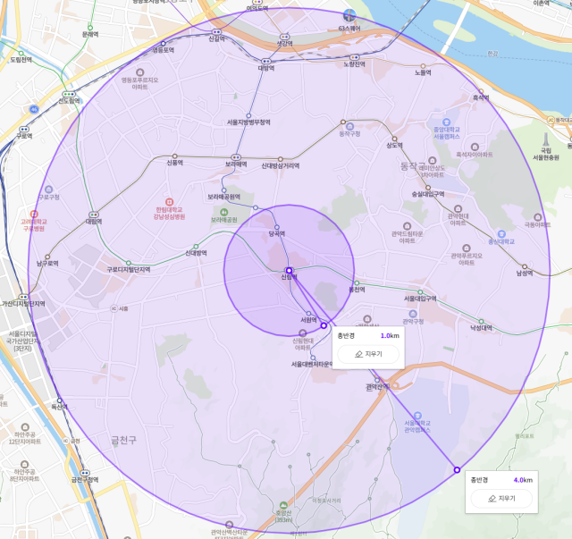 음식점 입장에서 반경 4km에서 반경 1km로 주문 범위가 줄어든다는 것은 치명적인 타격이다. <그림 2>에서 확인되듯이, 거리가 4분의 1로 줄어든다는 것은 면적이 16분의 1로 줄어든다는 뜻이다. 특히 하루 중 가장 중요한 저녁 시간대에 주문 거리제한이 빈번하게 걸리기 때문에 그날 하루의 매출이 급감하게 된다. 기존 단골 고객을 유지하고 신규 고객을 유입시키는 데도 마이너스로 작용한다.