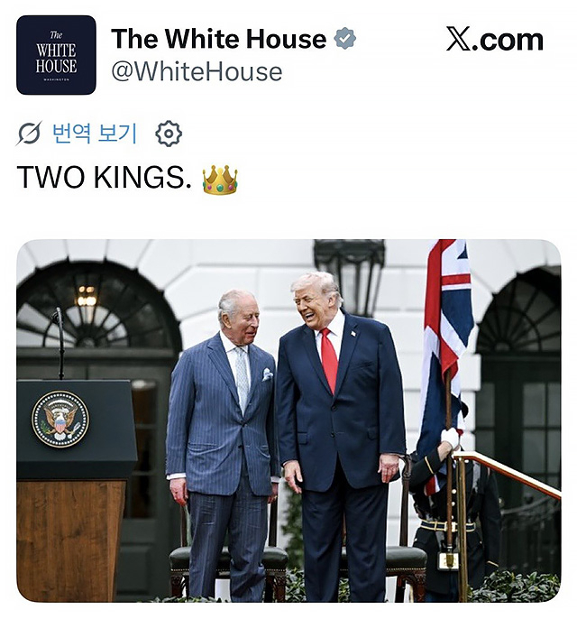 찰스 국왕이 이처럼 우회적인 방식으로 트럼프 대통령의 행태를 꾸짖고 반박한 가운데, 백악관은 트럼프 대통령을 규탄하는 이른바 '노킹스'(No Kings, 왕은 없다) 시위를 비웃기라도 하듯 찰스 국왕과 트럼프 대통령이 나란히 찍힌 사진에 "TWO KINGS(두 명의 왕)"이라는 설명을 달아 SNS인 'X'의 공식 계정에 게재했다.