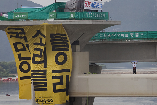 | ▲ 환경단체 회원들이 4대강 사업 건설 현장에서 시위를 하고 있다. ⓒ프레시안(최형락) |