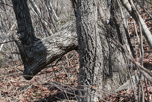 어느 새 작은 산의 꼭대기에 올랐다. 곧이어 평탄한 능선길이 정상으로 이어지면서 여느 산과 마찬가지로 참나무 종류인 신갈나무, 졸참나무, 갈참나무, 상수리나무 등이 도열해 있다. 그 중에 눈길을 끄는 굴참나무가 있었다. 나무가 특이한 형상을 하고 있다. 뿔이 길게 달린 사슴이 고개를 내밀고 물을 마시는 모습이 그대로 박제된 모습이었다. 이 나무와 사슴의 운명을 엮어서 이야기 하나를 만들어 볼까.