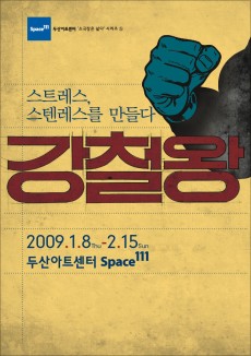 두산아트센터 스페이스111에서 2월 15일까지 공연하는 연극 <강철왕>은 가족에 대한 스트레스 때문에 강철이 되어버린 사내의 이야기다. 아버지를 향해 총을 난사하던 철남과 달리 강철왕은 분노를 고스란히 참고 견디다 철덩어리로 승화(?)해 버린다.