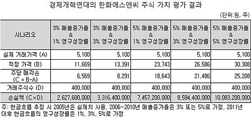 총수일가에 한화에스앤씨가 헐값으로 매각돼 ㈜한화가 손실을 입었다는 뜻이다. 경제개혁연대는 손실액 규모가 최소 26억 원, 최대 100억 원에 이르는 것으로 추산했다.