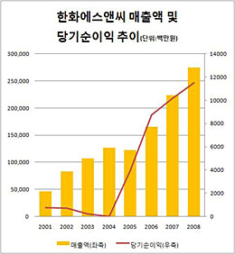 한화에스앤씨는 지난 2004년을 제외하고 매년 큰 폭의 이익증가를 이룬 안정적인 회사다. 매출액의 55.48%(2008년 기준)가 ㈜한화와 한화건설 등 한화그룹 계열사에서 나온다. 경제개혁연대는 "설립 이후 줄곧 영업이익을 내던 한화에스앤씨가 유일하게 적자를 낸 2004 회계연도 직후 거래를 한 것도 평가가격을 낮출 수 있는 시점을 의도적으로 선택한 것 아니냐는 의심이 든다"고 했다.