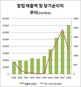 먼저 한컴의 경우 지난 1999년부터 2004년 사이 대체로 200억 원 내외를 맴돌던 매출액이 한화에스앤씨의 자회사가 된 직후인 2005년(355억 원)부터 급격하게 늘어났다. 지난해는 706억 원에 달한다.