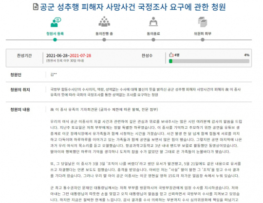 "공군 성추행 사건, 국회 국정조사 해야" 국민동의청원 시작