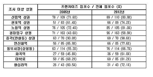 | ▲ 서울 지역 주요 상권 내 프렌차이즈 업체 비중을 조사한 결과, 지난 2005년에 비해 평균 10% 이상 프랜차이즈 업체 상권 점유율이 증가했다. ⓒ에프알엔베스트먼트 |