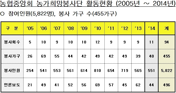 농가희망봉사단은 농협중앙회 안전총무부 소속 기술지원 및 시설관리를 담당하는 직원들로 구성되어 2005년에 결성됐다. 지금까지 464농가에 대해 사랑의 집 고쳐주기 재능기부 봉사활동을 전개하고 있다. 앞으로도 지속해서 봉사를 통해 전국적으로 더 많은 농가에서 혜택 받을 수 있도록 한다는 방침이다.