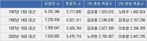 1987년 직선제 재도입 이래 서울의 표심 추이는 단순했다. 1987년 김대중 1위, 1992년 김대중 1위, 1997년 김대중 1위, 2002년 노무현 1위.