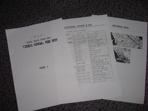 고양시는 관련기관과 상의해 대운하 비밀문건을 만든 것으로 알려졌다. 또한 이 문건을 통해 서울에서만 해도 마포 상암지구, 마포 잠두봉 지구, 양천 양화지구, 영등포 여의도지구, 용산 용산지구, 성동 서울숲 지구, 광진 뚝섬지구, 송파 잠실지구 등 무려 8곳이 경부운하 터미널 유치계획안을 갖고 있음이 밝혀졌다.