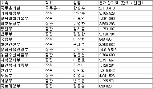 | ▲ 국무총리 및 국무위원 재산등록 현황 ⓒ프레시안 |