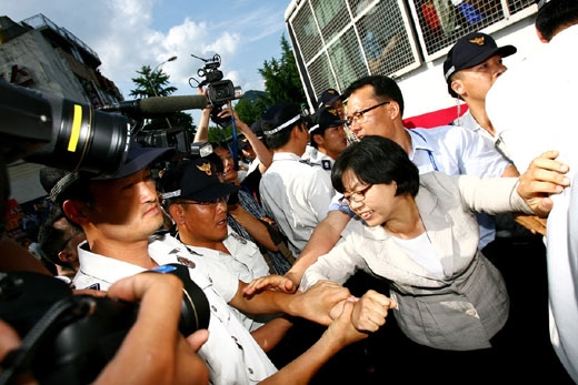 경찰은 이 의원의 항의를 묵살하며 경찰차에 태워 은평경찰서로 호송했다. 이 의원 측은 연행 과정에서 경찰의 성추행 의혹까지 제기하고 있다. 민노당은 "이성을 잃은 이명박 대통령에 대한 결사항전을 선언한다"며 반발하고 있고 통합민주당도 이 의원 연행 사태를 강하게 비난했다.