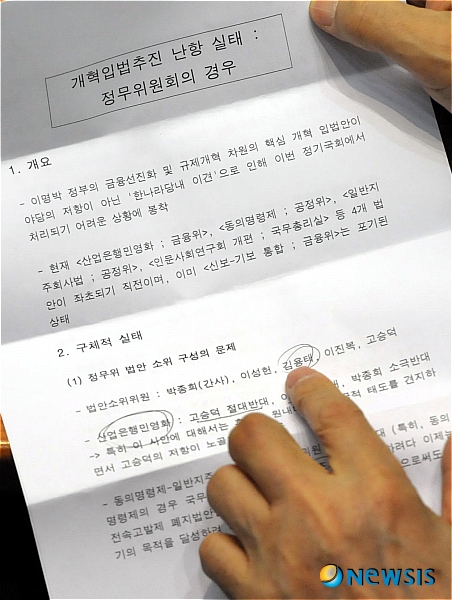이 문건은 "이명박 정부의 금융선진화 및 규제개혁 차원의 핵심 개혁 입법안이 야당의 저항이 아닌 '한나라당내 이견'으로 인해 이번 정기국회에서 처리되기 어려운 상황에 봉착"이라면서 "현재 <산업은행민영화 ; 금융위>, <동의명령제 ; 공정위>, <일반지주회사법 ; 공정위>, <인문사회연구회 개편 ; 국무총리실> 등 4개 법안이 좌초되기 직전이며, 이미 <신보-기보 통합 ; 금융위>는 포기된 상태"라고 적시했다.