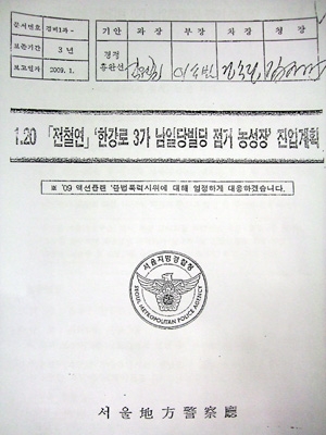한편, 이 문건은 김석기 서울경찰청장 등이 강조한 대로 "(농성자들이) 경력 및 행인 차량 등 상대로 새총 발사 및 화염병과 벽돌, 염산이 든 박카스병 투척 등 강력 저항"이라고 적시되어 있다. 사태와 무관한 일반 시민이 피해를 입을 수 있음을 강조한 것.