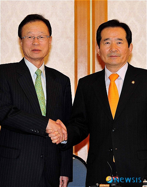 | ▲ 2일 오후 최종안에 합의한 한나라당 박희태 대표와 민주당 정세균 대표ⓒ뉴시스 |
