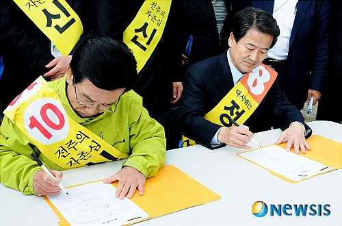 | ▲ 정동영, 신건 두 후보가 함께 '사전 복당원서'를 작성하고 있다ⓒ뉴시스 |
