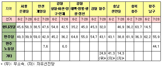 이와 관련해 다음의 표는 6.2 지방선거에서 각 정당의 광역단체장들이 얻은 득표율과 7.28 재보궐선거에서 각 정당 후보들이 획득한 득표율을 비교한 것이다. 이 표가 보여주고 있는 바와 같이, 다수의 지역에 따라서는 6.2 지방선거 결과와 7.28 재보궐선거의 결과가 매우 다르다. 이를테면 서울 은평을, 인천 계양을, 충남 천안을, 충북 충주, 광주 남구 등이 그 경우이다. 반면 강원도에서는 양 선거 결과의 추세가 크게 변화하지는 않았다.