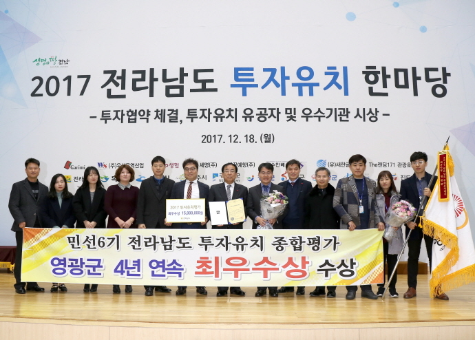 영광군은 지난 18일 전남도청에서 개최된 투자유치 종합평가 시상식에서 민선6기 시작과 함께 지역경제 활성화를 군정 역점과제로 삼고 과감한 기업유치 전략을 펼친 결과 4년 연속 최우수상을 수상하고 시상금 1,540만원을 받는 쾌거를 이뤘다.