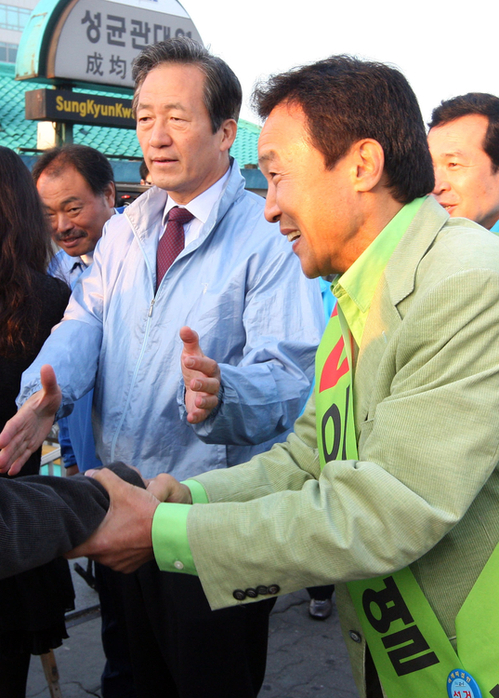 | ▲ 수원 장안 지역 유세에 나선 한나라당 정몽준 대표와 민주당 손학규 전 대표 ⓒ 연합 |