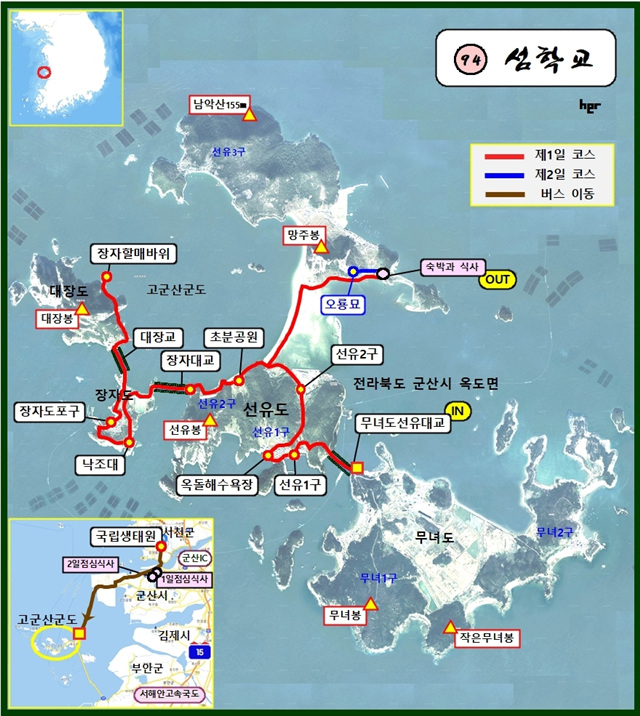 무녀도선유대교→선유1구→옥돌해수욕장→선유2구→초분공원→장자대교→낙조대→장자도포구→대장교→ 장자할매바위→선유도숙소