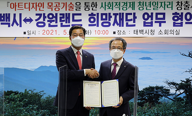 이날 협약은 고용노동부에서 실시한 ‘지역·산업 맞춤형 일자리 창출지원사업’공모에 태백시와 강원랜드희망재단, 강원랜드 사내벤처‘우드리즘’이 함께 계획한 ‘아트디자인 목공기술을 통한 사회적경제 청년 일자리 창출사업’이 선정돼 진행됐다.