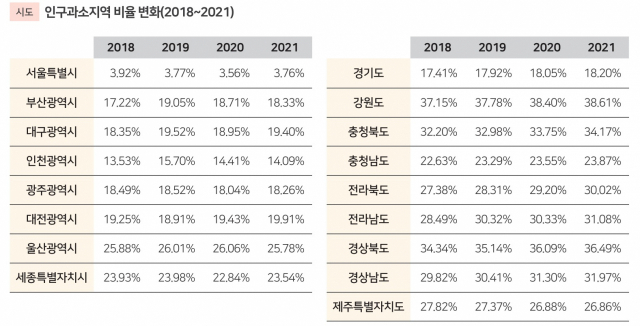 인구과소지역은 2018년 전국적으로 13.3%에서 2021년 14.3%로 1%P가 증가했다.