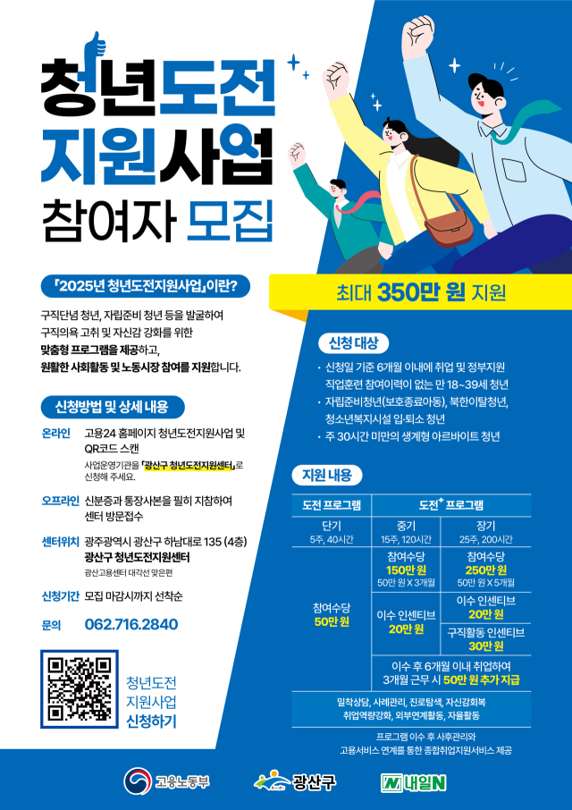광산구는 청년 216명을 선착순 모집하며, 참여를 희망하는 청년은 고용24 또는 광산구 청년도전지원센터(062-716-2840)로 문의·신청하면 된다.