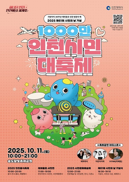 재외동포협력과가 주관하는 ‘재외동포 사진전’은 오전 11시부터 저녁 7시까지 열려 인천과 세계를 잇는 정체성을 조명한다. 예술정책과 주관의 ‘2025 시민문화예술제’는 낮 12시부터 밤 9시까지 3부로 진행되며, 에픽하이·어반자카파·HYNN(박혜원) 등이 무대에 올라 풍성한 공연을 선사한다.