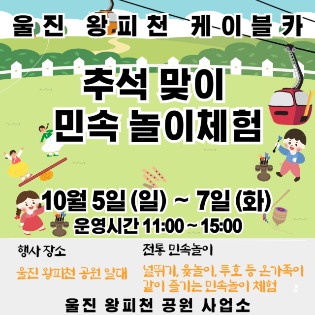 이번 행사는 오는 10월 5일부터 7일까지 왕피천공원 케이블카와 아쿠아리움 사이 광장에서 진행되며, 윷놀이·투호·널뛰기 등 전통 민속놀이 체험을 즐길 수 있다. 남녀노소 누구나 참여 가능해 가족단위 방문객들에게 큰 호응이 예상된다.