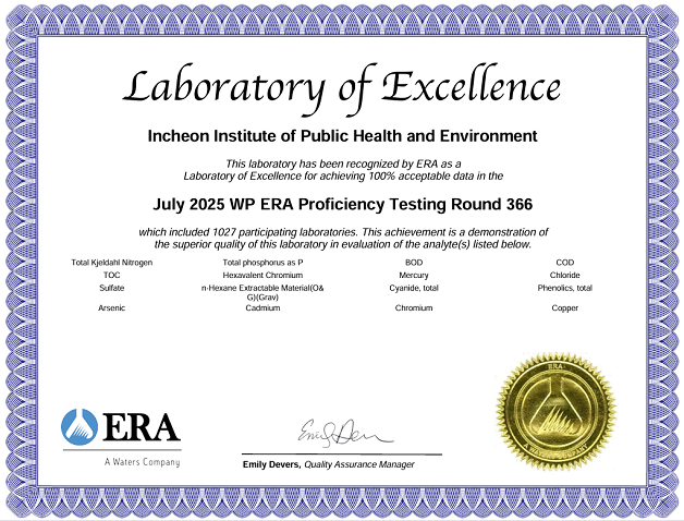 인천광역시 보건환경연구원은 미국 환경자원협회(ERA)가 주관한 '2025년 환경분야 국제숙련도 평가'에서 최우수 등급(Laboratory of Excellence)을 받았다고 26일 밝혔다.