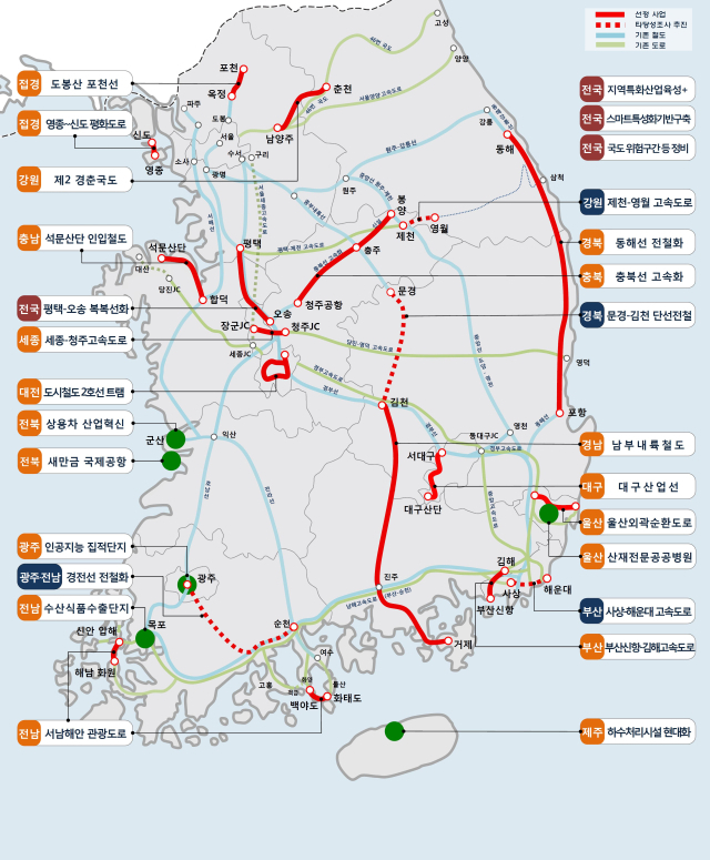 평택~오송 복복선화, 대전 도시철도 2호선 트램, 부산신항~김해 고속도로, 울산 산재전문공공병원 등 11개는 공사가 한창이다. 강원 제2경춘 국도, 충남 석문산단 인입철도, 세종~청주 고속도로, 경남 남부내륙철도 등도 행정절차를 밟으며 내년 착공을 준비하고 있다.