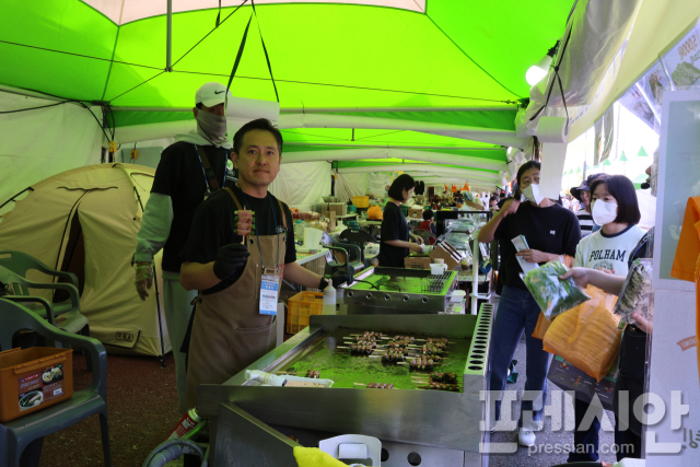 ▲2025청원생명축제장에서 심승기 청년농업인연합회장이 판매하고 있는 상품을 소개하고 있다 ⓒ프레시안(김규철)