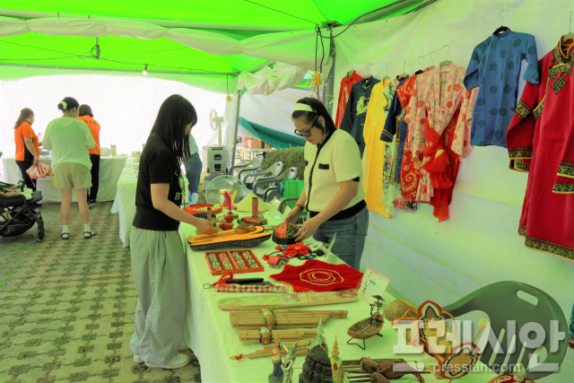 ▲청원다문화가족지원센터 관계자들이 2025청원생명축제장에서 결혼이주여성들의 모국 문화에 대한 홍보를 준비하고 있다 ⓒ프레시안(김규철)